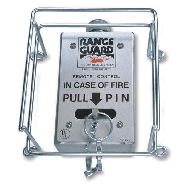 This SURFACE-MOUNT REMOTE PULL GUARD works with Pyro-Chem®, Range Guard®, Kidde, Amerex®, or Buckeye remotes, reducing false discharges of fire systems from accidental snagging of manual remote pulls on clothing, food carts, etc. Measures 5 3/16"H x 4 5/16"W x 3"D.
